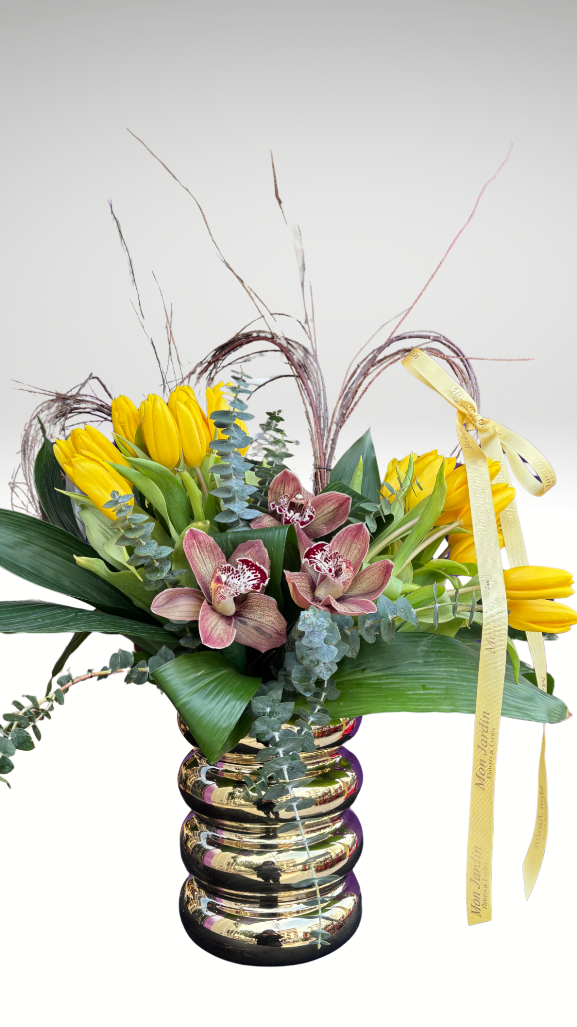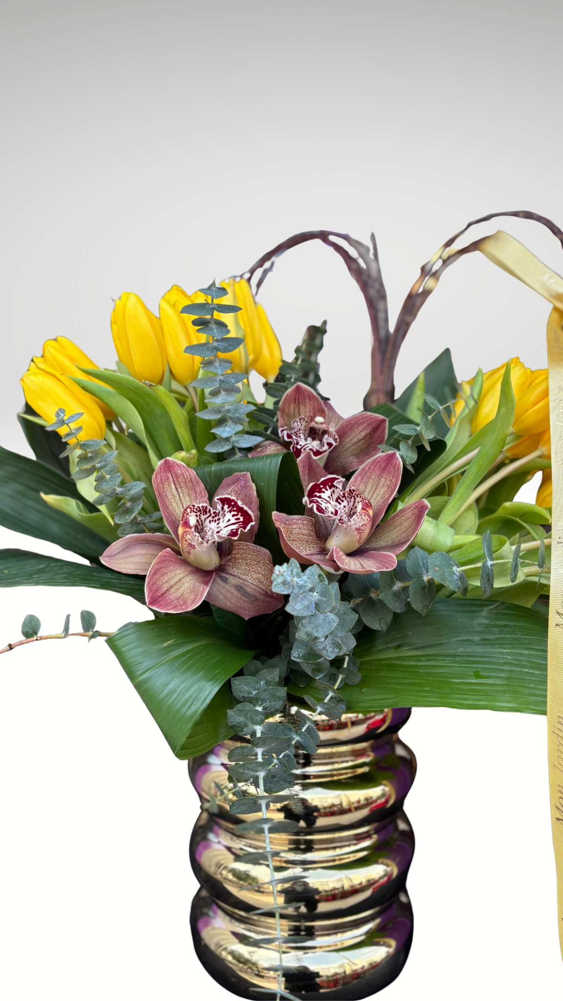 Özenle seçilmiş ithal sarı laleler, profesyonel floristler tarafından modern ve şık bir tasarımla bir araya getirilir. Doğum günü, yeni iş tebriği, teşekkür veya “içimden geldi” demek için ideal olan bu aranjman, bulunduğu ortama ferahlık ve pozitif enerji katar.