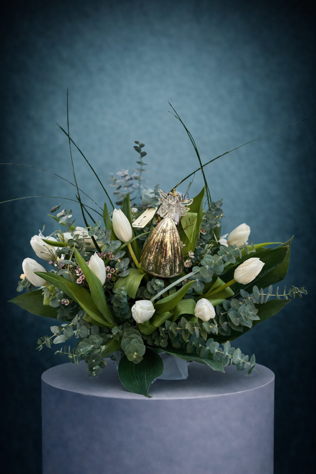 Beyaz lalelerden oluşan bu özel buket, sadeliğin en sofistike hâlini yansıtır. Her biri özenle seçilen laleler, kusursuz formu ve yalın şıklığıyla zamansız bir lüks sunar. Gösterişten uzak ama etkileyici; sessiz ama unutulmaz.