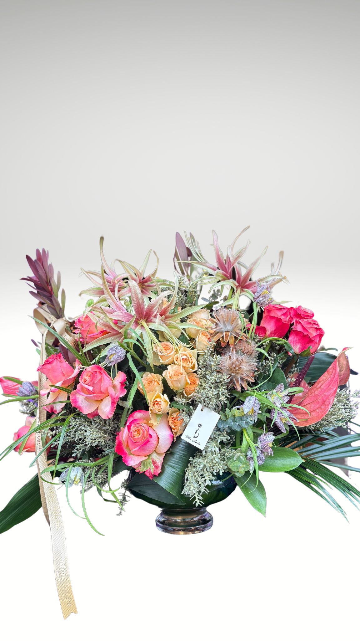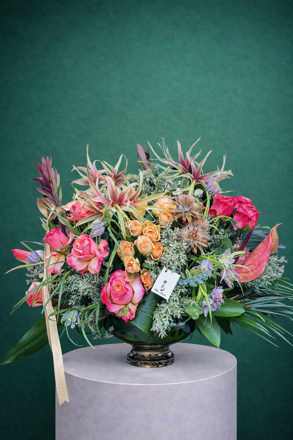 İthal çiçeklerimizin asil duruşu gül ve lalelerin zarafetleriyle buluşarak kusursuz bir uyum sunar. İncelikli hazırlanmış bu özel aranjman romantizmi lüks bir yorumla iafede etmek isteyenler için tasarlanmıştır.