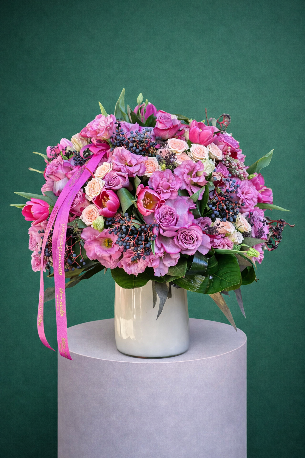 İthal çiçeklerimizin asil duruşu gül ve lalelerin zarafetleriyle buluşarak kusursuz bir uyum sunar. İncelikli hazırlanmış bu özel aranjman romantizmi lüks bir yorumla iafede etmek isteyenler için tasarlanmıştır.