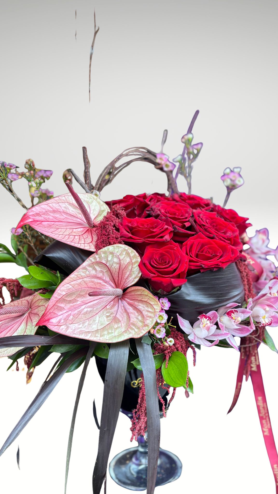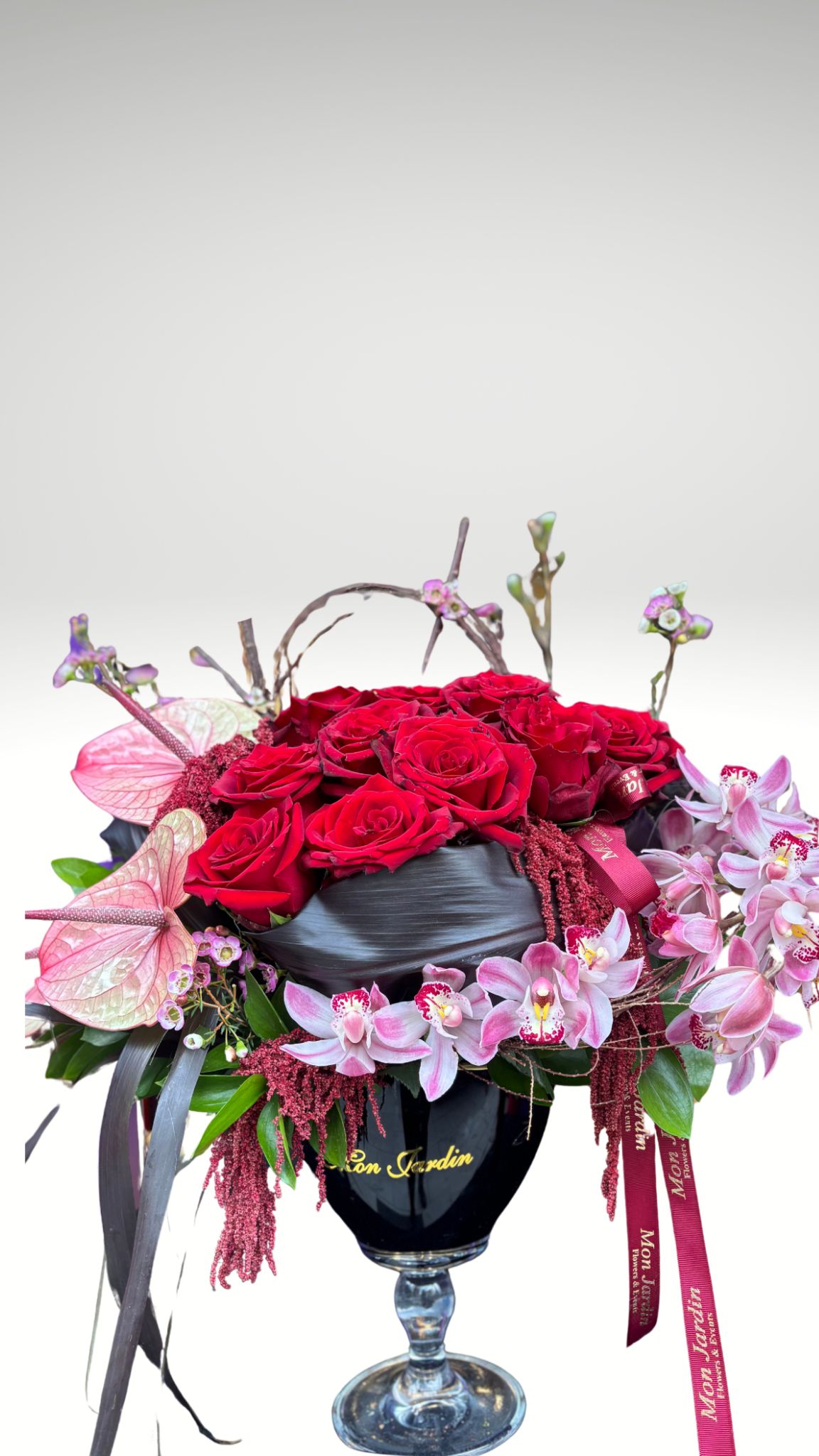 Tutkunun ve aşkın en güçlü sembolü kırmızı güller, özenle tasarlanmış bu şık aranjmanda bir araya geliyor. İthal ve taptaze kırmızı güllerden oluşan aranjmanımız; Sevgililer Günü, yıldönümü, doğum günü ve “seni seviyorum” demenin en zarif yolu. Modern dokunuşlarla hazırlanan bu özel tasarım, duygularınızı kelimelere ihtiyaç duymadan ifade eder. Mon Jardin yazılı cam vazo içerinde aranjman hazırlanmıştır