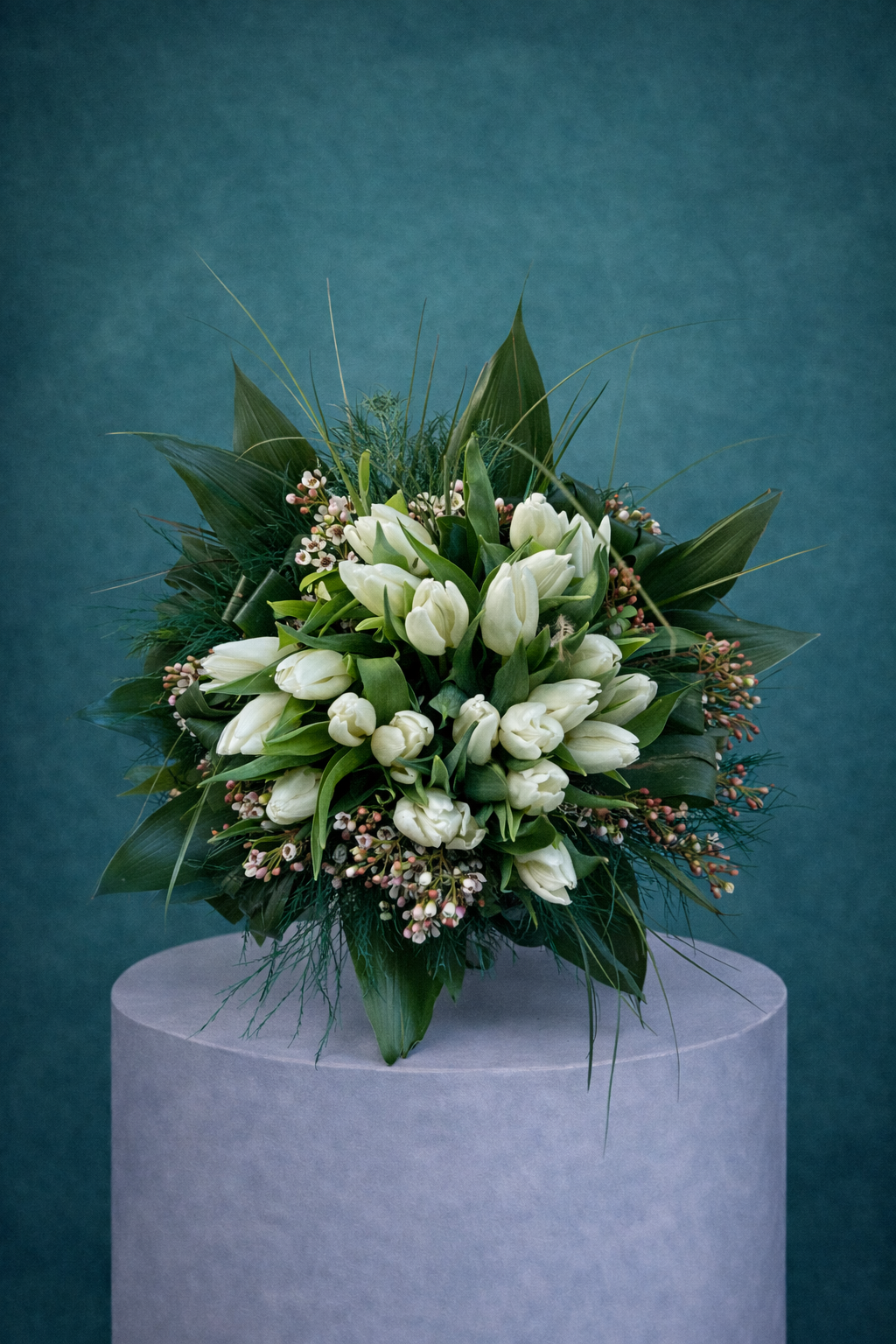 Beyaz lalelerden oluşan bu özel buket, sadeliğin en sofistike hâlini yansıtır. Her biri özenle seçilen laleler, kusursuz formu ve yalın şıklığıyla zamansız bir lüks sunar. Gösterişten uzak ama etkileyici; sessiz ama unutulmaz.