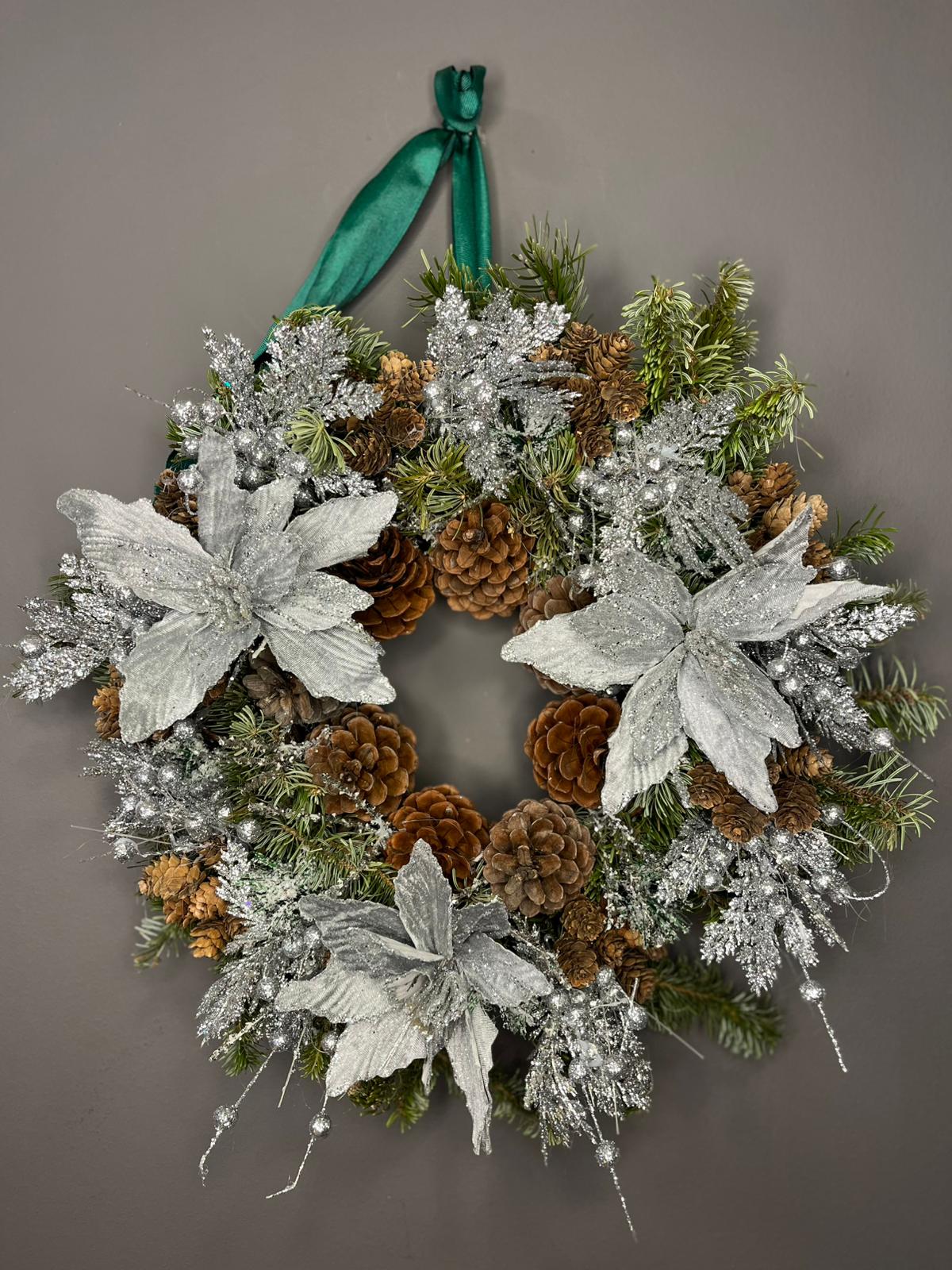 ÜRÜNÜMÜZ GRİ YILBAŞI ÜRÜNLERİNDEN OLUŞMAKTADIR. CANLI ÇAM ÜZERİNE YAPILMIŞTIR. ASMAK İÇİN KURDELESİ BULUNUR. ÇAPI 45 CM. TEK ÜRÜNDÜR.