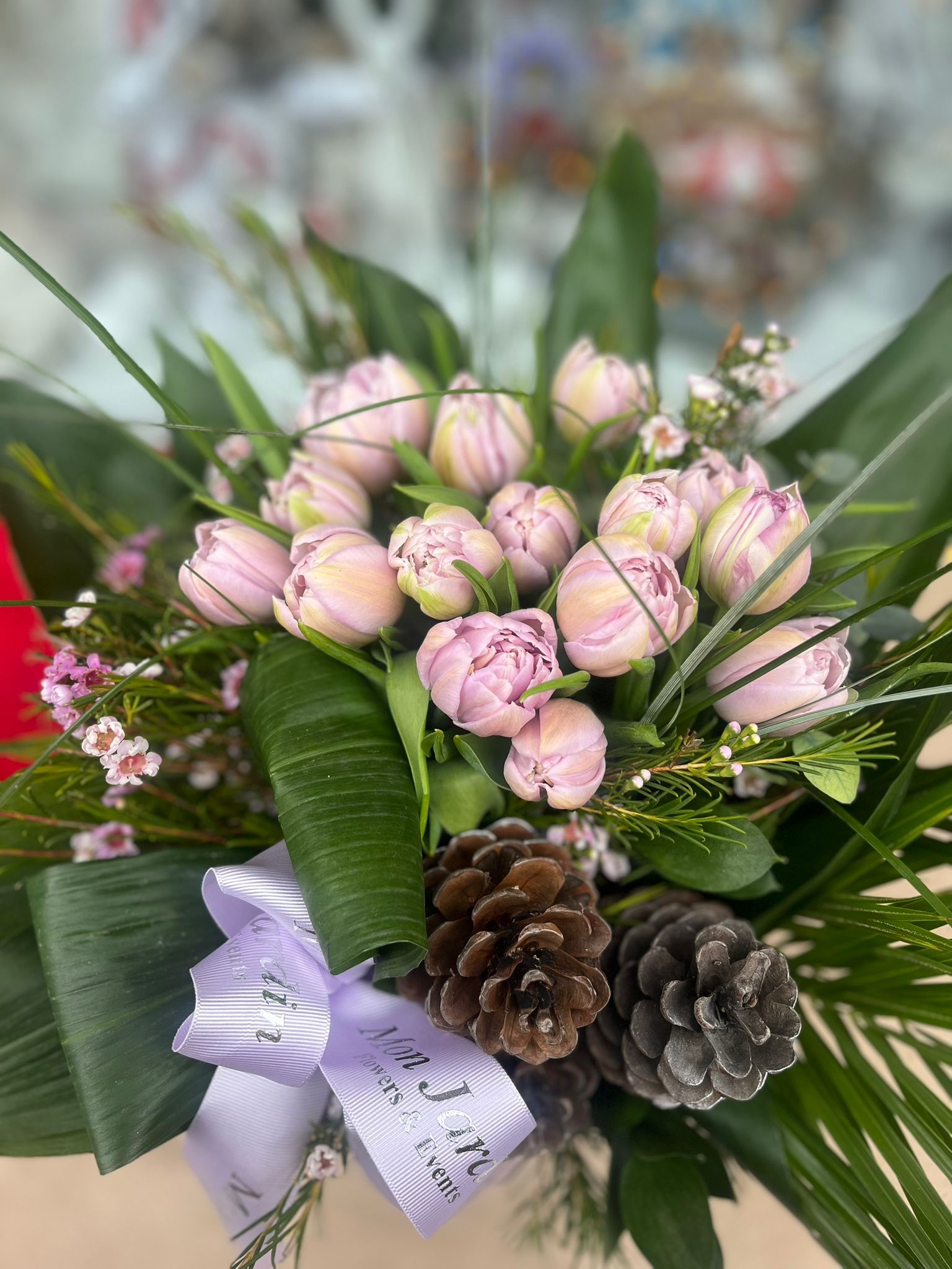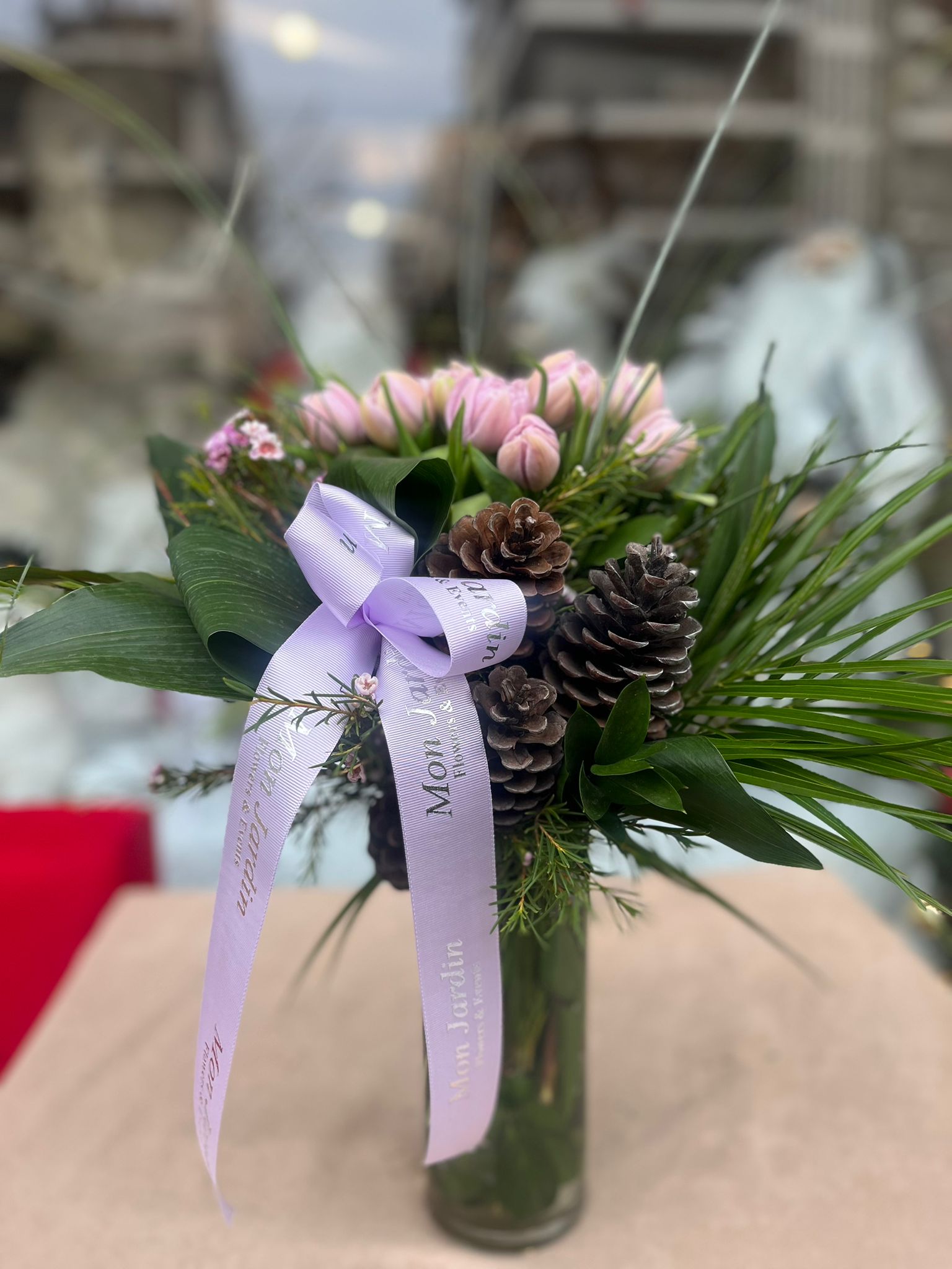 CAM VAZO İÇERİSİNDE 15 ADET LİLA LALE BULUNMAKTADIR