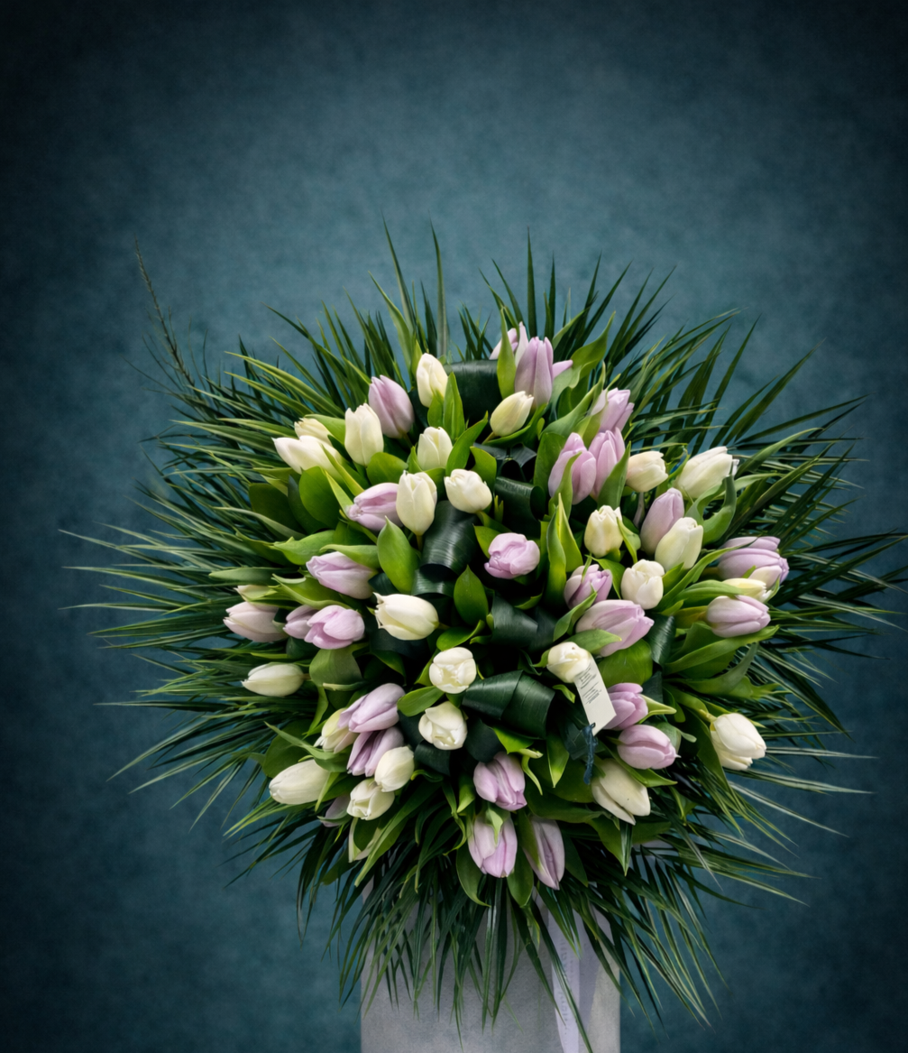 Beyaz lalelerden ve pembe lalelerden oluşan bu özel buket, sadeliğin en sofistike hâlini yansıtır. Her biri özenle seçilen laleler, kusursuz formu ve yalın şıklığıyla zamansız bir lüks sunar. Gösterişten uzak ama etkileyici; sessiz ama unutulmaz.
