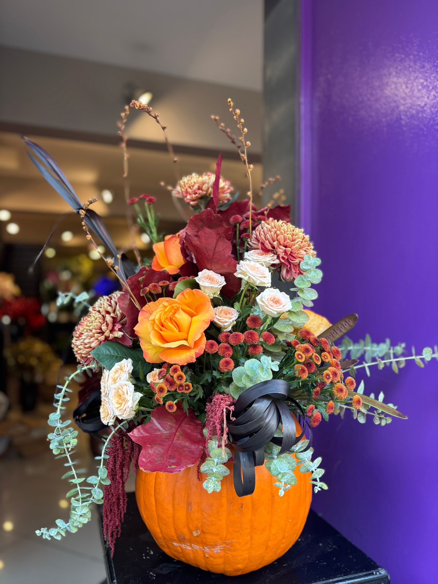 Balkabağının üzerine sonbahar tonlarındaki çiçeklerle hazırladığımız aranjman.