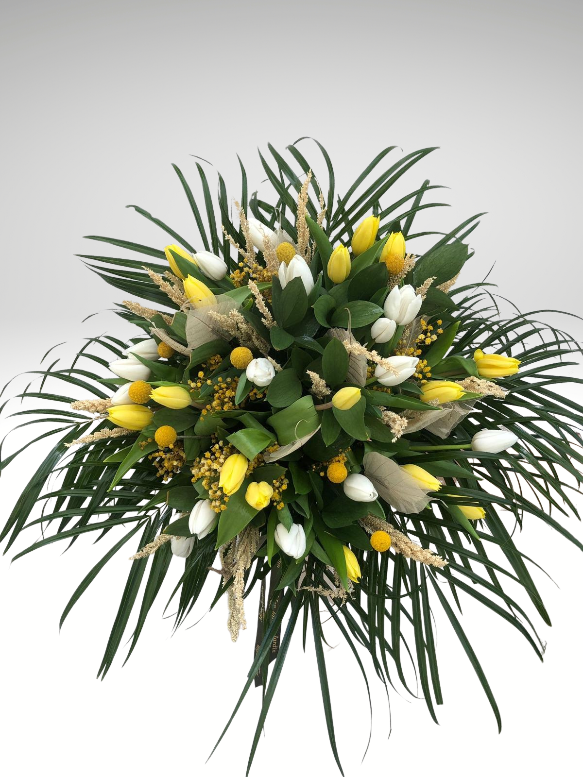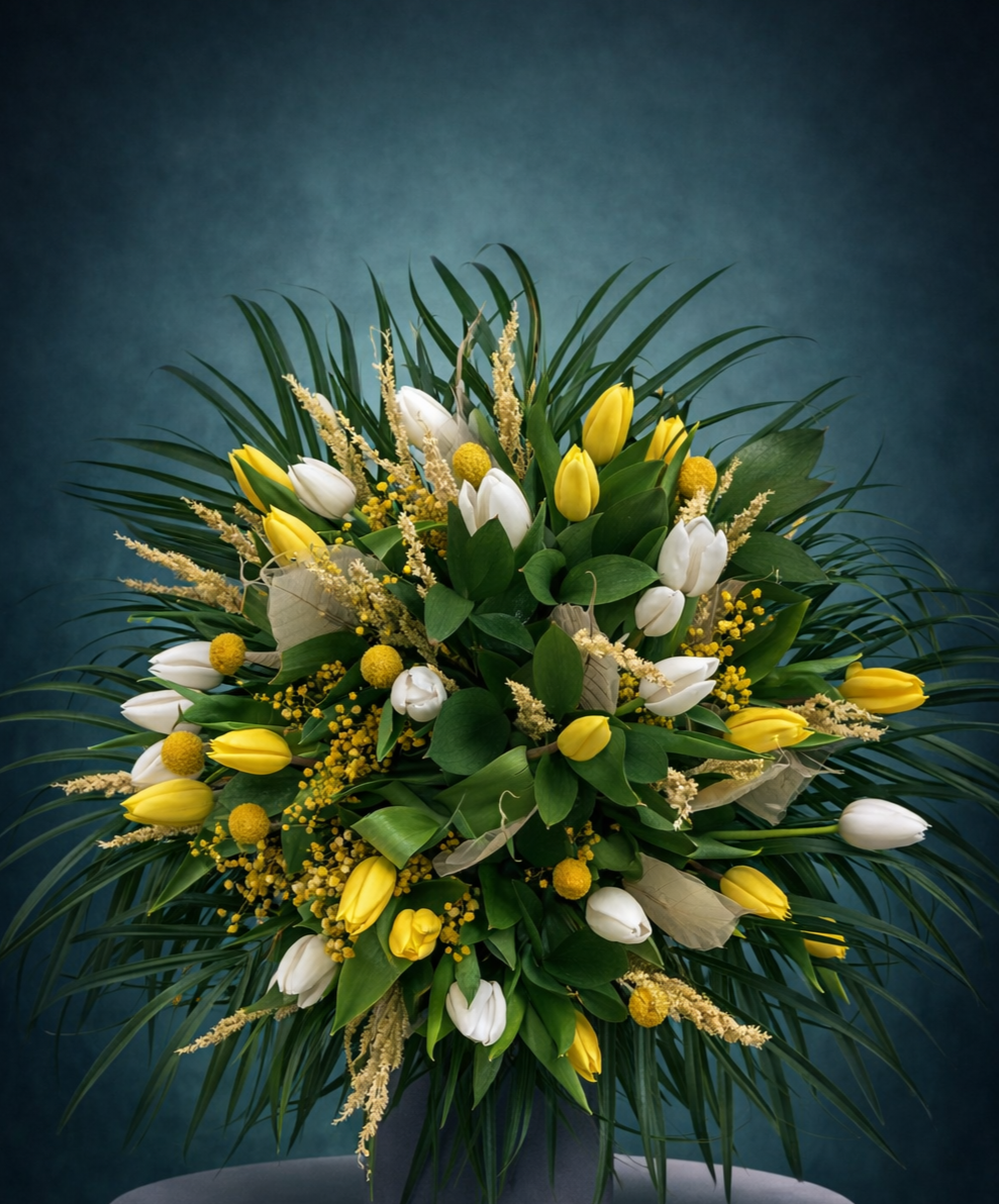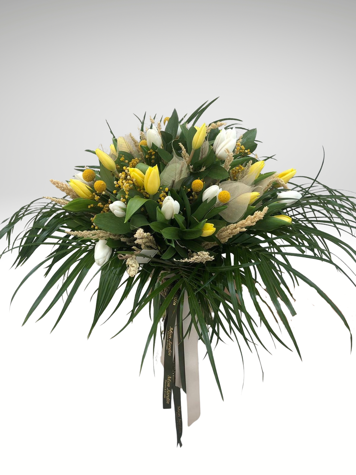 Beyaz lalelerden ve sarı lalelerden oluşan bu özel buket, sadeliğin en sofistike hâlini yansıtır. Her biri özenle seçilen laleler, kusursuz formu ve yalın şıklığıyla zamansız bir lüks sunar. Gösterişten uzak ama etkileyici; sessiz ama unutulmaz.