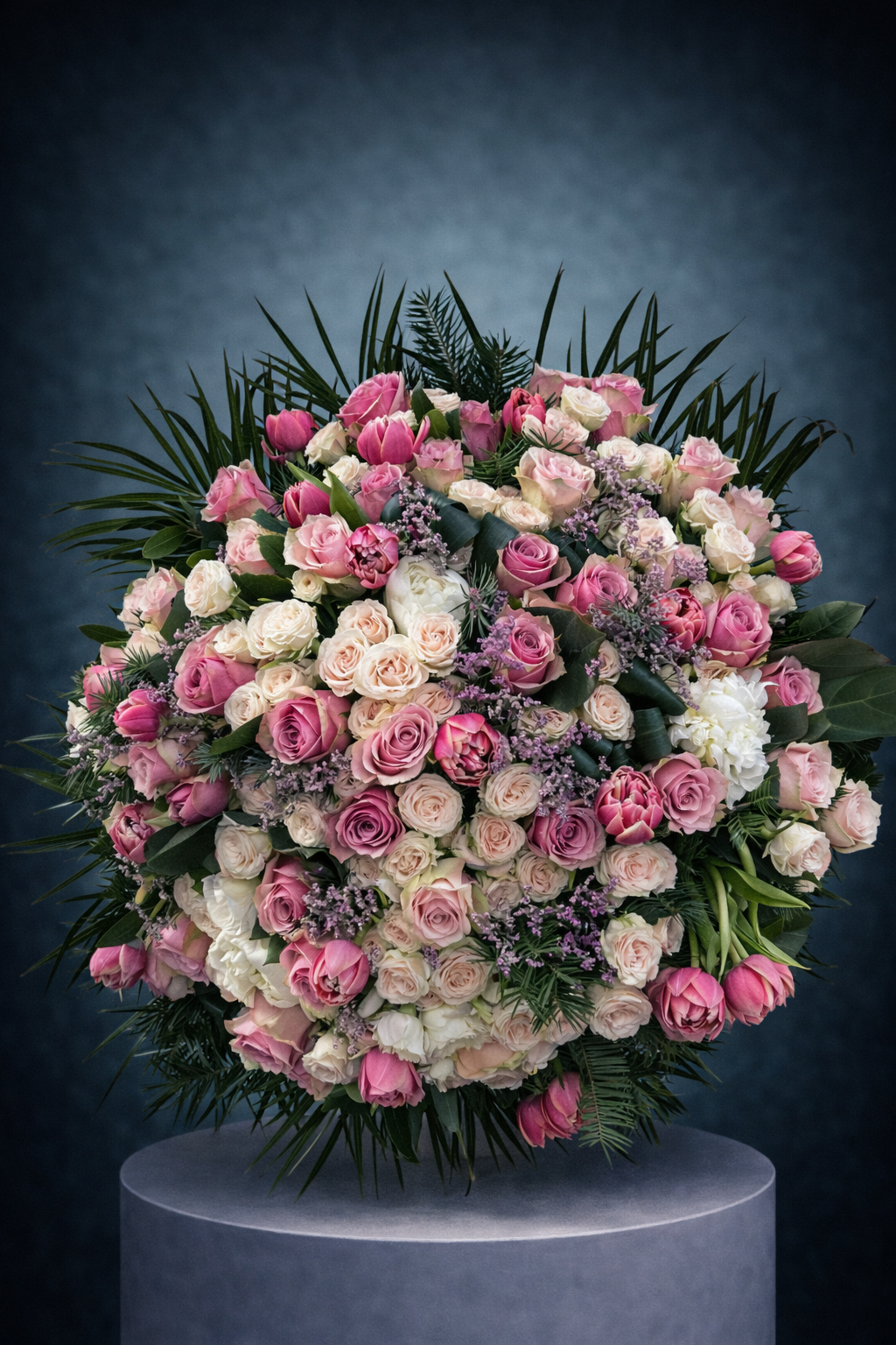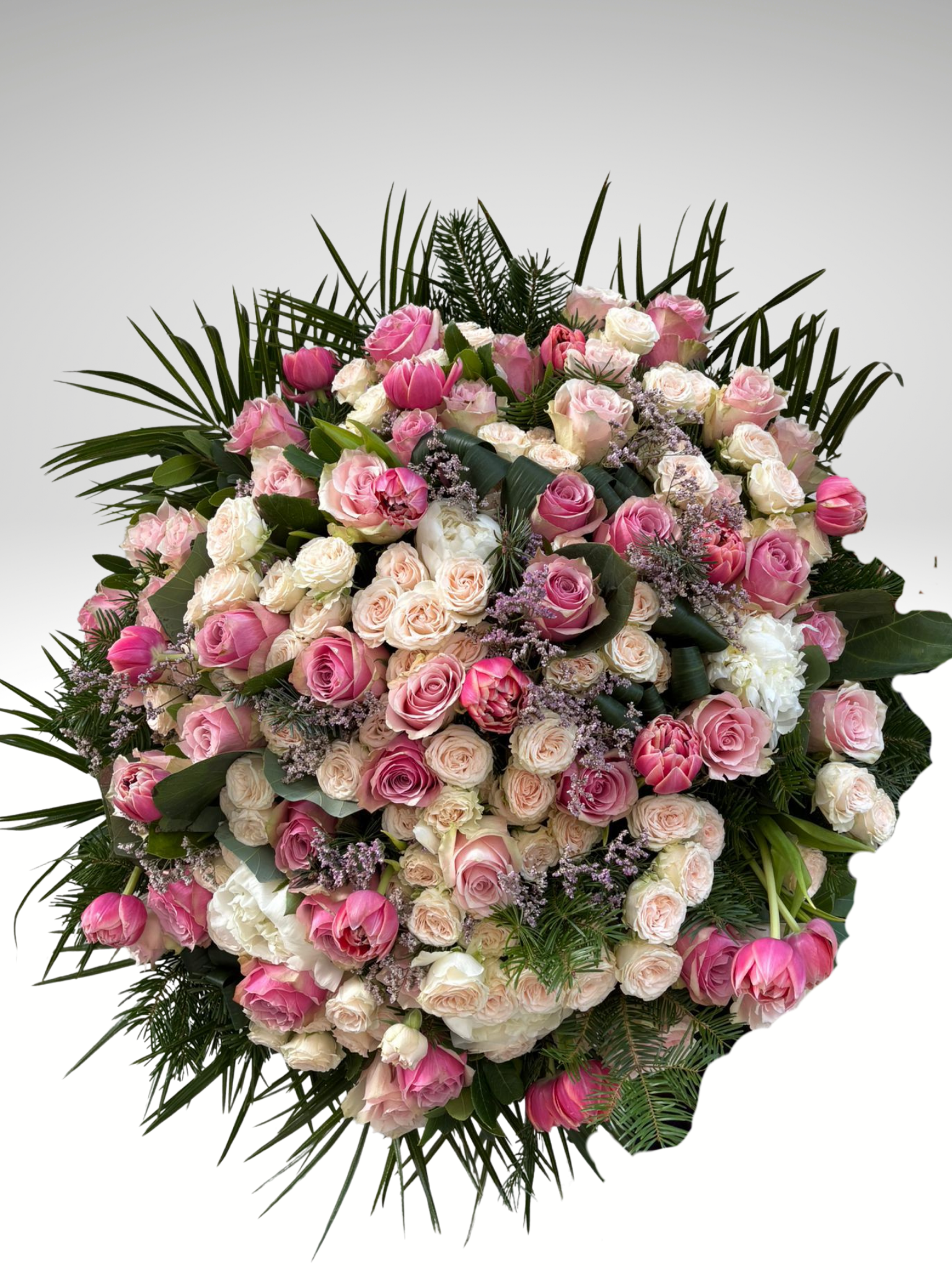 Zarafetin ve romantizmin kusursuz uyumu… Pudra pembe ve krem tonlarındaki ithal güller, mevsimin en taze canlı çiçekleri ve seçkin yeşillikler ile hazırlanan bu özel buket; ihtişamlı hacmi ve sofistike renk geçişleriyle ilk bakışta büyüler.